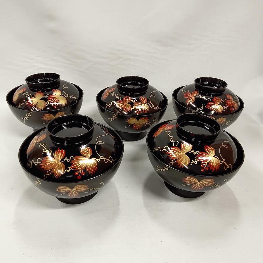 未使用 蒔絵の施された吸物椀 5客です。内祝をしまい込んでいたものです。未使用ですが長期保管により経年劣化しているかもしれません。中の椀、軽くチェックしましたが傷もなく美品です。外の木箱が汚れ・日焼け・落書き等、経年劣化しています。