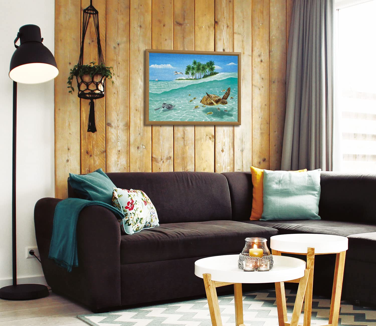 作家キャロライン スティールの作品 「ブルーオアシス」ゆったり泳ぐ海亀が癒しの時間へと誘う。