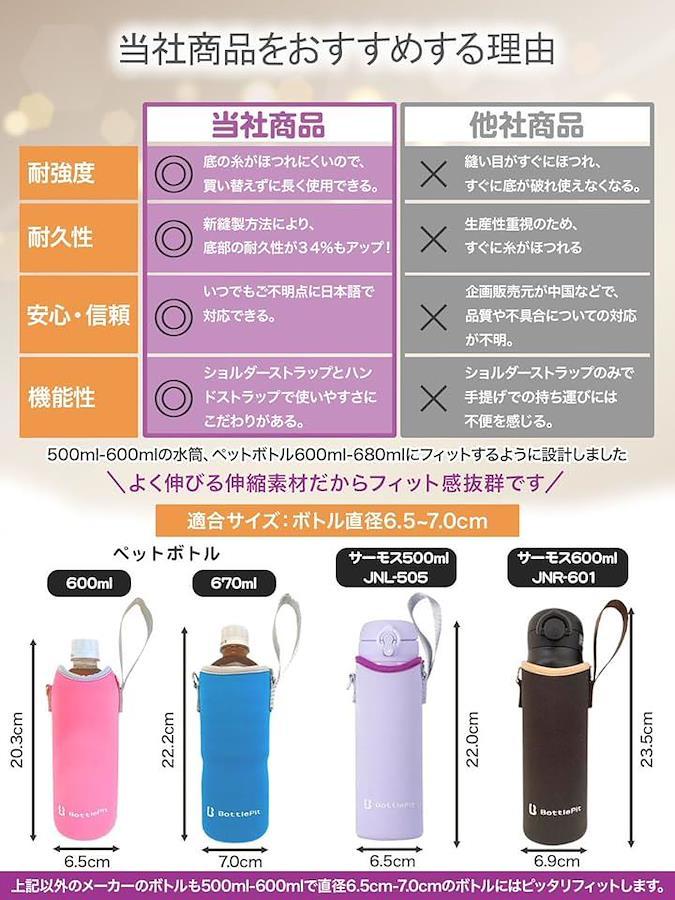 耐久性と耐熱性のあるネオプレン素材でぴったりフィットの水筒カバーでしっかりホールド。