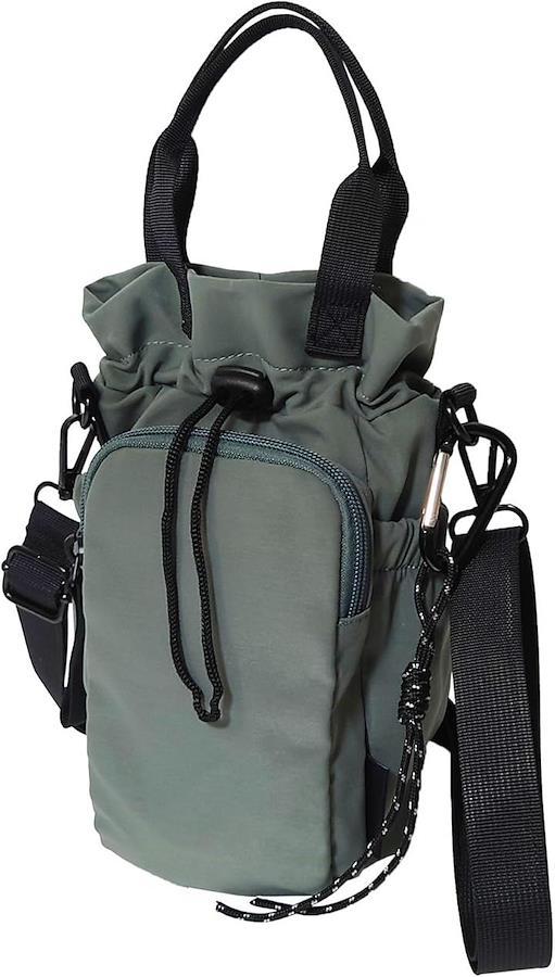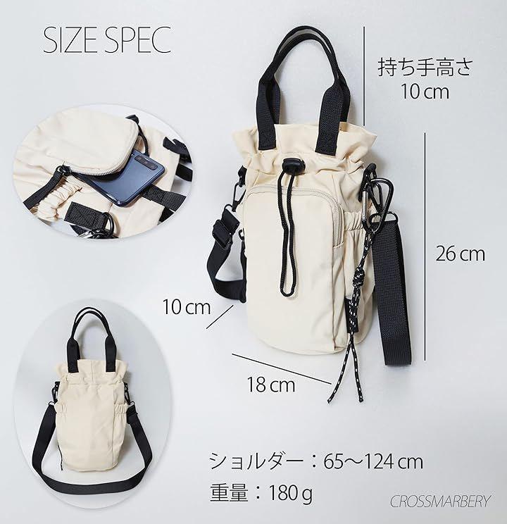 「素材」ナイロン 「仕様」開閉:巾着、内側:メッシュポケットx1、外側:オープンポケットx2、ファスナーポケットx1、カラビナx1 「サイズ」横幅:18cm、高さ:26cm、マチ:10cm、持ち手高さ:10cm、ショルダー:65cm~124cm 「重さ」約180g * ペットボトル500mlが2本収納可能ですが形状により不可能な場合がございます。