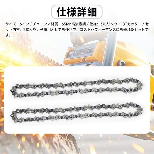 【仕様詳細】サイズ:6インチチェーン/材質:65Mn高炭素鋼/仕様:37Eリンク・18Tカッター/セット内容:2本入り。予備用としても便利で、コストパフォーマンスにも優れたセットです。