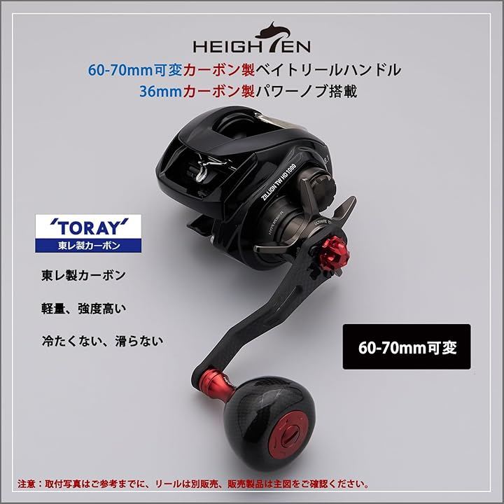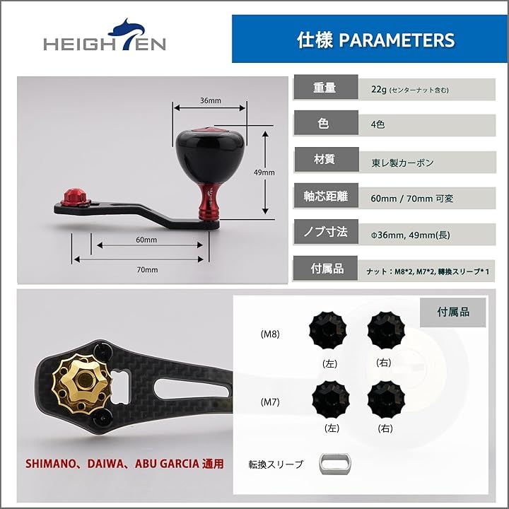 「サイズ」ノブ直径36mm、ハンドル軸心距離60/70mm可変「重量」22g「素材」東レカーボン。