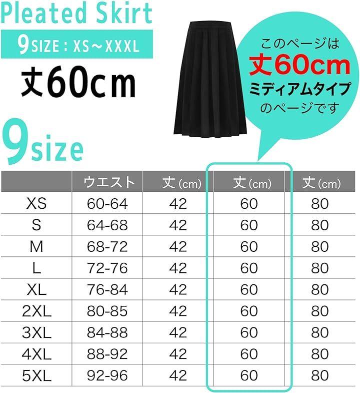「サイズ」XS,S,M,L,XL,2XL,3XL,4XL,5XL 「カラー」ブラック(黒)「スカート丈」ミドル膝丈(60cm)「素材」ポリエステル 3タイプの丈をご用意。