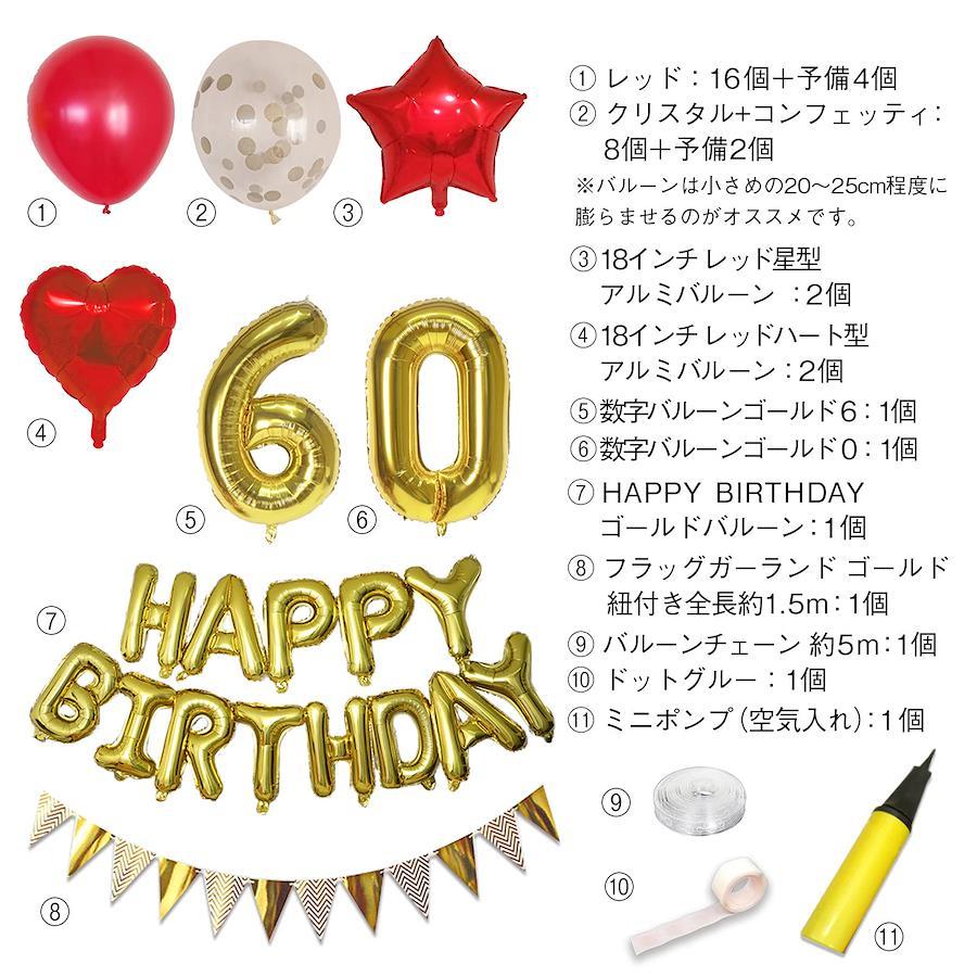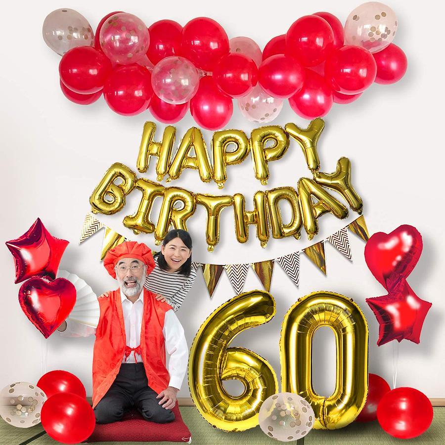 3営業日以内に発送≪新品未開封品≫パッケージ内容:・「6」「0」数字バルーンゴールド(膨らまし時の高さ約65cm)・HAPPY BIRTHDAY アルファベットバルーン 1セット ・ハート型フィルムバルーン 2個 18インチ(膨らますと約35cm程度) ・星形フィルムバルーン 2個 18インチ(膨らますと約35cm程度) ・ゴム風船 赤20個 クリアコンフェッティ10個 2色(膨らますと20~30cm程度) ・フラッグガーランド(約1.5m) 1巻 ・バルーンチェーン(約5m) 1巻 ・ドットグルー 1巻 ・空気入れポンプ※こちらのセット商品は、膨らんでいない状態でのお届けになります。?用途:還暦のお祝い、誕生日の飾りつけ バースデーパーティー デコレーション ?商品の撮影には最大限注意を払っておりますが、閲覧時のモニター環境によりましては実際の商品と若干違うお色味に映ることもございます。?パッケージに含まれているバルーンチェーンを使用し、バルーンガーランドにして壁などに取り付けると華やかさが際立ちます。ぜひお試しください。【重要】コンフェッティバルーンの紙吹雪が風船の内側にきれいに付くために(画像通り)、摩