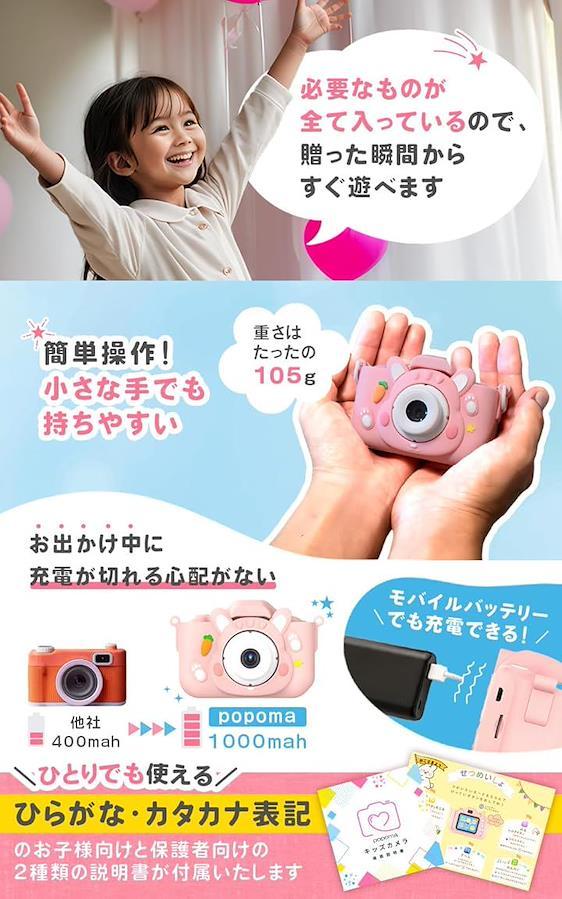 「popomaキッズカメラのおすすめポイント」キッズカメラには、かわいいウサギのポーチがセットになっています。