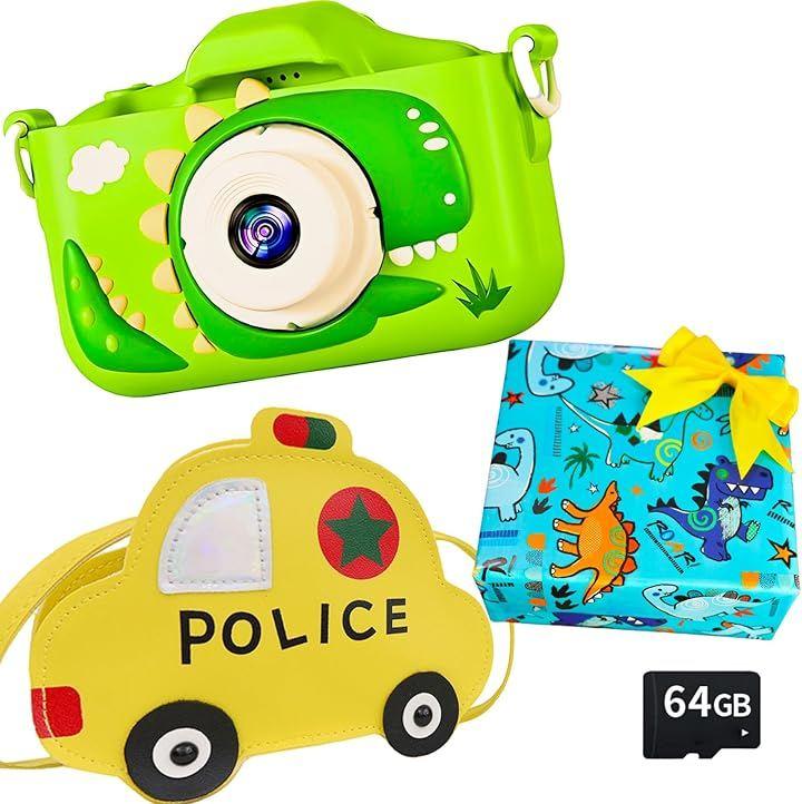 64GB Kids Camera with Police Car Pouch, Toy for Kids, Game Function, Music Player, 8x Zoom, Hiragana Instructions Included, Dinosaur Design, Boys' Gift