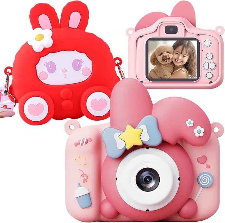 「popomaキッズカメラのおすすめポイント」キッズカメラには、かわいいウサギのポーチがセットになっています。