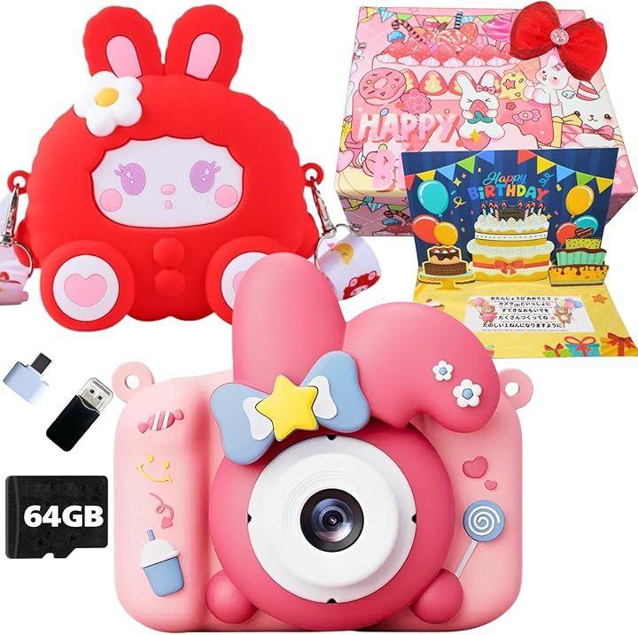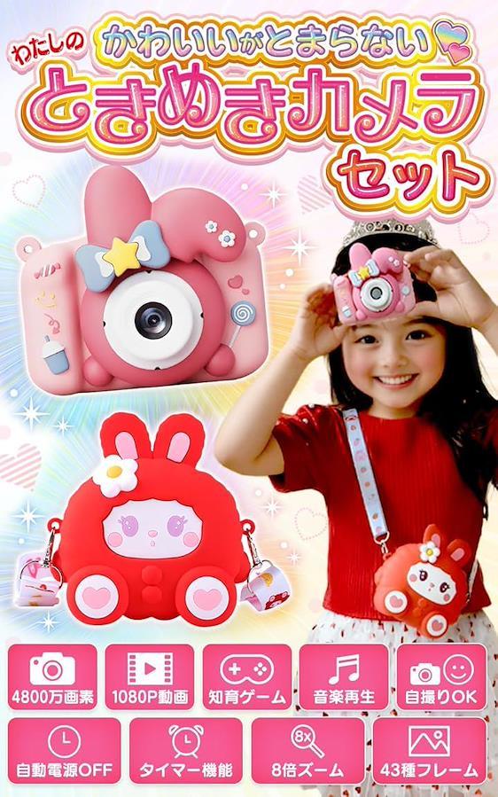 「popomaキッズカメラのおすすめポイント」キッズカメラには、かわいいウサギのポーチがセットになっています。