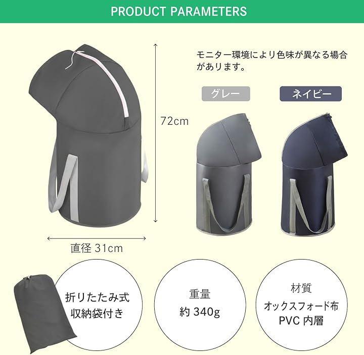「商品仕様」サイズ:直径31cm x 高さ72cm/重量:約340g/材質:オックスフォード布+PVC内層/カラー:ネイビー・グレー/折りたたみ式・収納袋付き/モニター環境により色味が異なる場合があります。