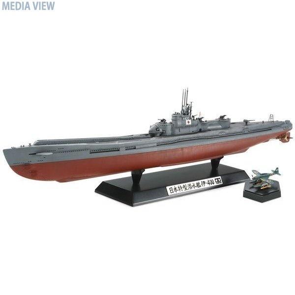 タミヤ 1/350 艦船No.19 日本特型潜水艦 伊-400 プラモデル上下分割式の船体はスライド金型により全面に精密な彫刻を施しました。内壁までリアルに再現された格納筒は3機の晴嵐を収納した状態で組み立て可能。飛行可能状態の晴嵐も2機セット。カタパルト上で射出直前の状態やドーリーに乗せての展示も選べます。クレーンアーム、晴嵐のプロペラなどはエッチングパーツを用意。クレーンやアンテナなどは可動式で収納状態も再現できます。展示用の台座付き。 1/350スケール ※組み立て・塗装の必要なプラモデルです。