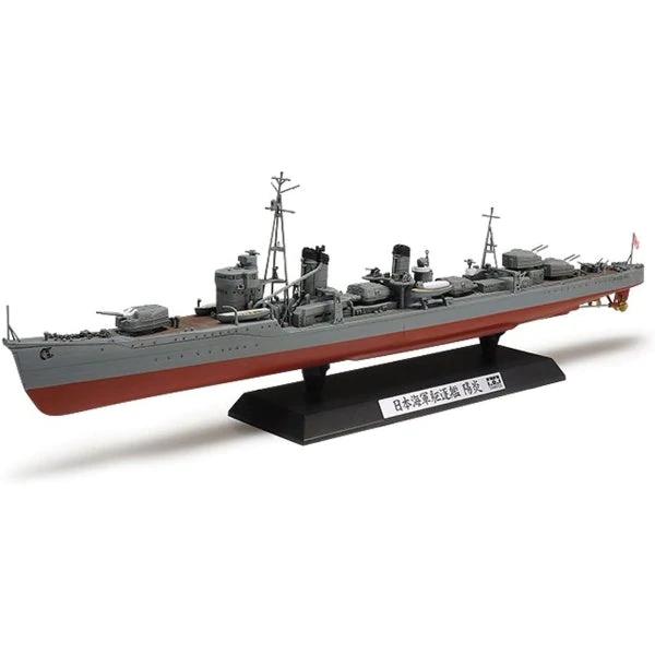 タミヤ 1/350 艦船シリーズ No.32 日本海軍 駆逐艦 陽炎 プラモデル 78032 フルハル、ウォーターラインの選択式で、フルハル状態での展示用台座が付属。船体は左右分割式として外板の継目や舷外電路も繊細に表現。陽炎型本来のシンプルな形状の艦橋、艦橋窓には透明パーツを使用。アンカーチェーンとプロペラシャフトは質感の高い金属製とし、前後マストや旗竿などは折れにくいABS樹脂製。主砲塔3基と魚雷発射管2基はポリキャップにより旋回可能。船体後部には2基の12.7cm連装砲を搭載。船尾甲板にはパラベーン (掃海具)や機雷、演習砲を装備。パラベーン用のクレーンやループアンテナ、プロペラガードなどはエッチングパーツでシャープな仕上がり。全長338mm、全幅31mm。