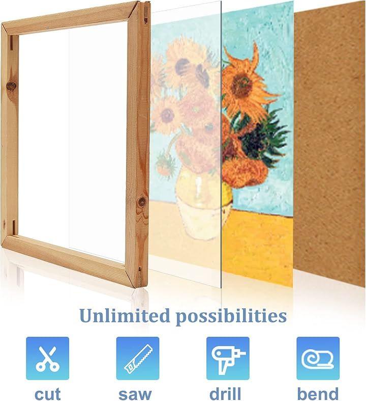 幅広い用途:フォトフレームガラスの交換、アートプロテクター、プラスチックキャンバス、レーザー彫刻看板、卓上プロテクターなど、さまざまな芸術的および専門的なプロジェクトに使用できます。