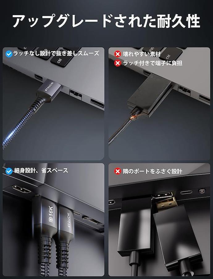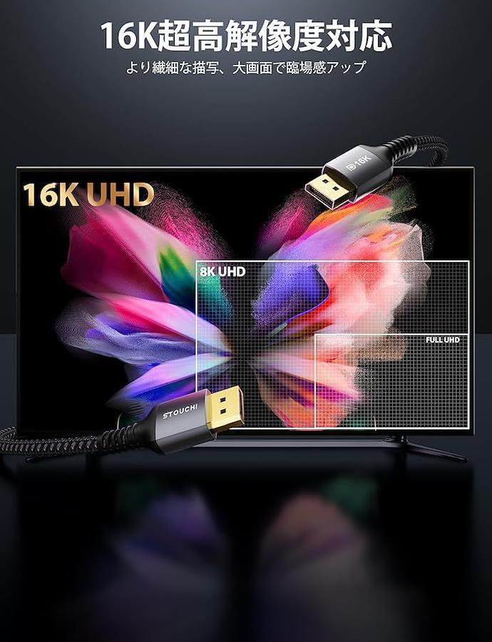 「16K対応・DP2.1最上位規格・将来まで使える1本」DisplayPort 2.1(UHBR20)準拠、最大80Gbpsの超広帯域を実現。