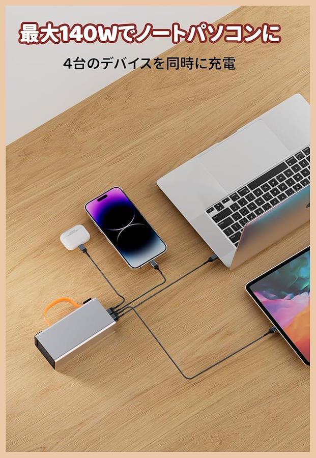 2 つの 140W USB-C ポートと 2 つの 22.5W USB-A ポートがあり、ノートパソコン、iPhone、サムスン、Switch、ドライブレコーダー、ドローン、カメラなど、複数のデバイスを同時に充電できます。