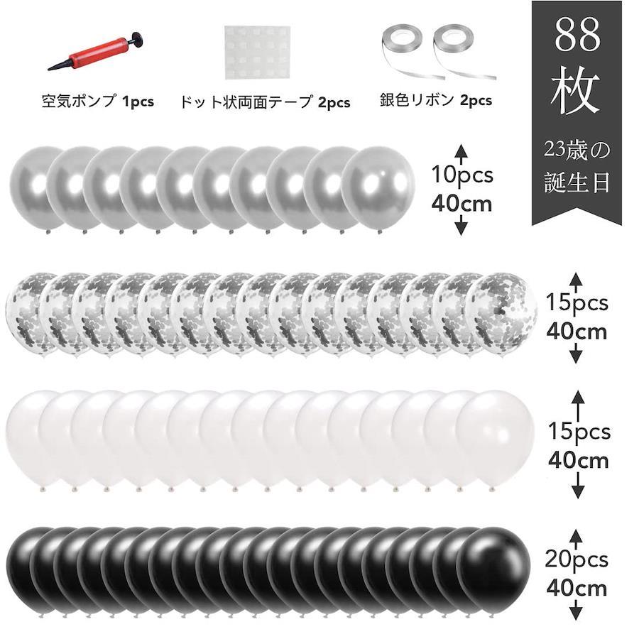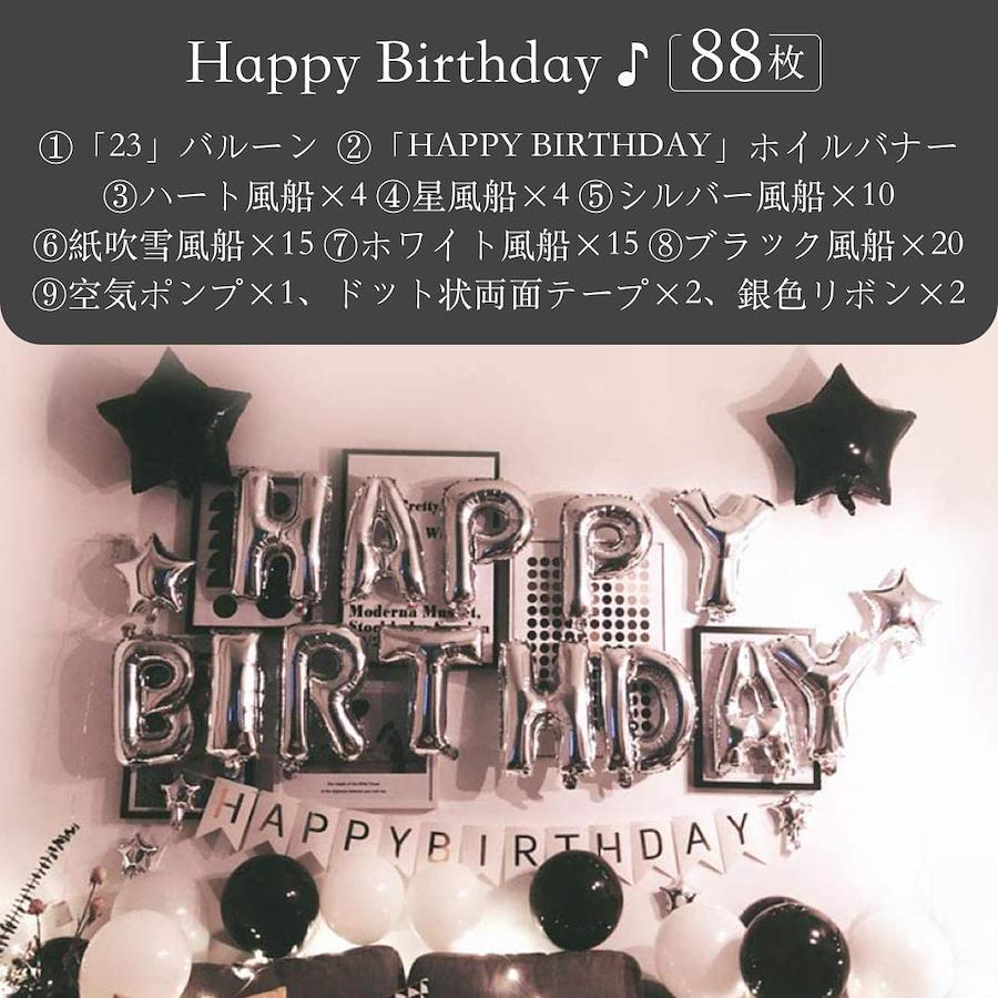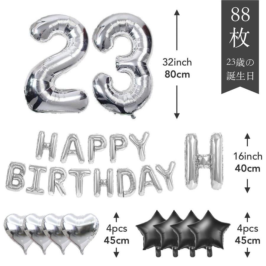 3営業日以内に発送≪新品未開封品≫【セット内容】①「23」バルーン×1 ②「HAPPY BIRTHDAY」ホイルバナー×1 ③ハート風船×4 ④星風船×4 ⑤シルバー風船×10 ⑥紙吹雪風船×15 ⑦ホワイト風船×15 ⑧ブラック風船×20 ⑨空気ポンプ×1、ドット状両面テープ×2、銀色リボン×2。自由にさまざまなスタイルを組み合わせることができます。高い人気の誕生日の装飾セット。【人気の飾りアイテムもたくさん♪】大きな数字のバルーン「23」をポイントに、豪華なクールな黒と白金の高い人気の誕生日の装飾セット。完璧な誕生日パーティー、写真撮影シーン、家の装飾。あなたはそれらを天井、壁、庭の枝に掛けたり、デザートテーブルを飾ったりすることができます。【便利な制作キット】 写真が示すように、風船のサイズがマークされています。 よくご確認ください。すべてのバルーンは平らになっています。独自のバルーンポンプで使用してください。家族や友達と一緒に楽しくデコレーションして、良い思い出を作ります。【高品質なバルーン】こちらのバルーンはお誕生パーティーに素敵な体験をしていただくために、高品質のアルミニウムフィルムを採用しました、バ