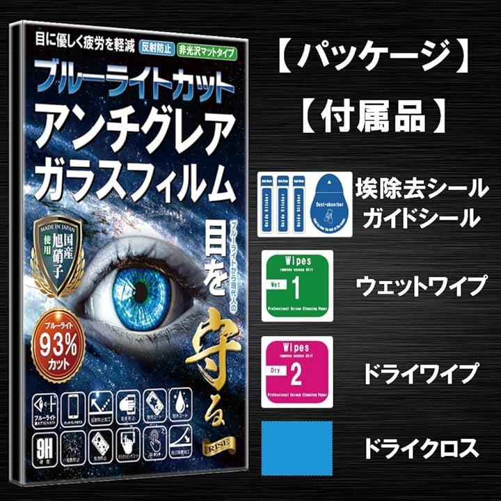 「内容品」アンチグレアブルーライトカットガラスフィルム1枚、ドライシート1枚、ウェットシート1枚、ホコリ吸着シート1枚、クリーニングクロス1枚及び日本語の貼付説明書が付属。
