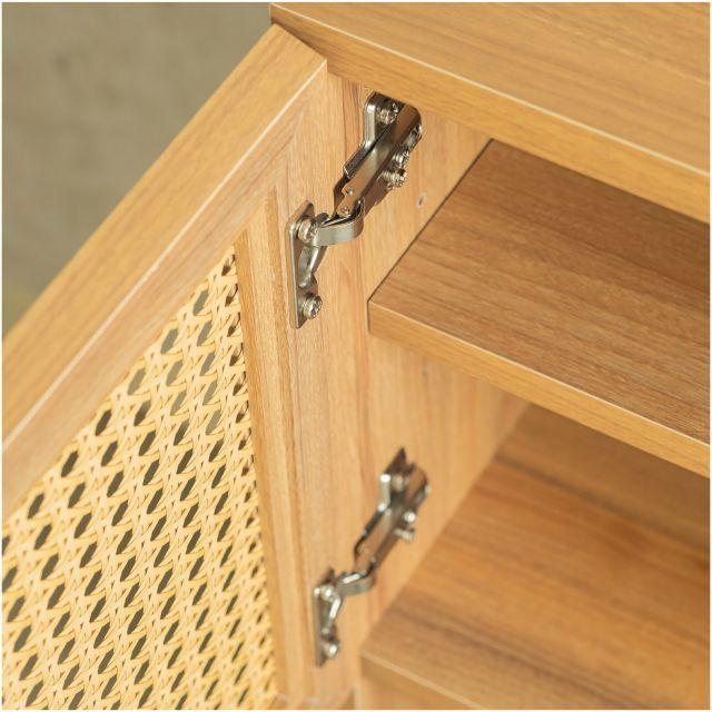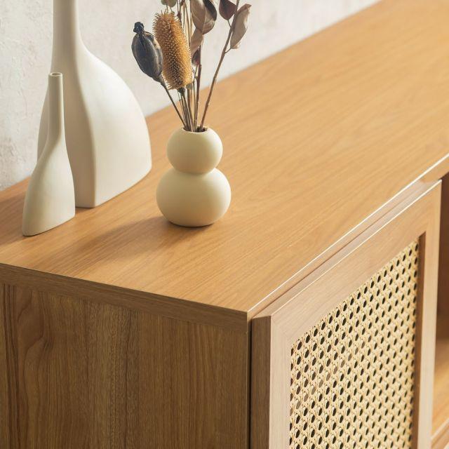 ナチュラルなラタン風素材が特徴のキャビネット<90キャビネットマルシェ>トレンド感あるスタイルのキャビネットです。奥行コンパクトで、一人暮らしのお部屋にも置きやすいサイズ感も魅力。前板はラタン風素材をカゴメ編みして仕上げています。こちらは韓国インテリアにもよく使われる装飾で、お部屋をぐっとおしゃれに見せてくれます。やさしく癒される雰囲気な上、抜けたデザインなのでリモコンも通ります。お部屋のコーディネートの際は、くすみカラーや真っ白な家具・ガラス素材を合わせていただくと、より韓国風な世界観を楽しめます♪脚部にはワンポイントで黒色を入れて、大人っぽい雰囲気にする事にこだわりました。高さが14cmあり、スッキリとした印象です。