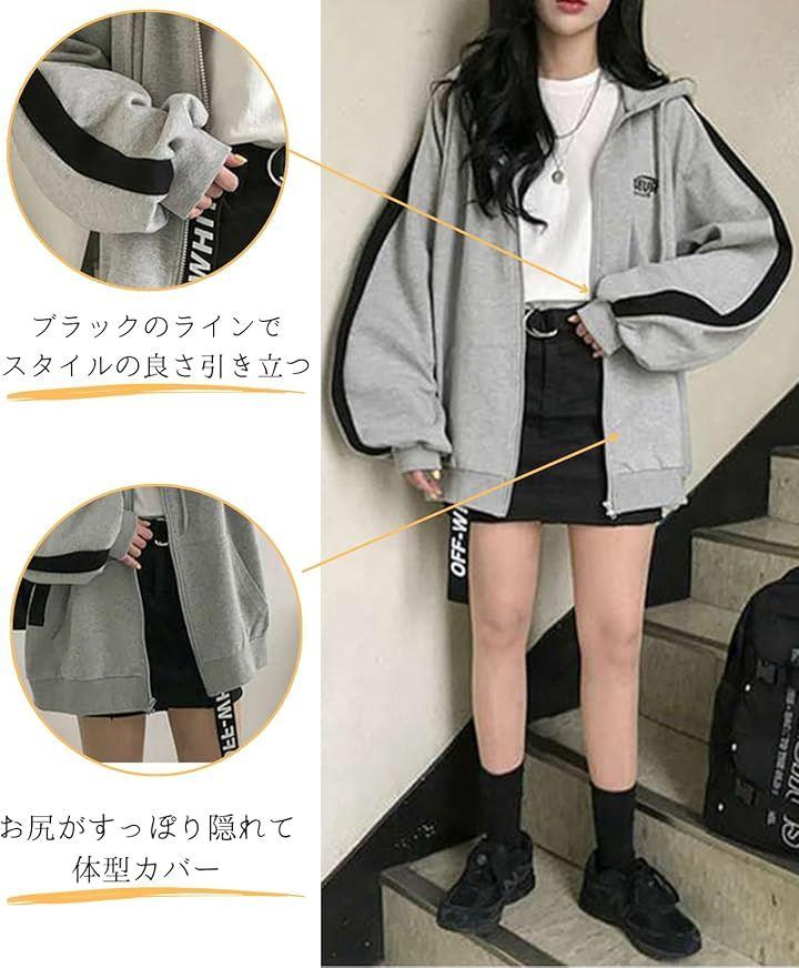 フード付きで小顔見えも叶い、さらっと羽織るだけで韓国風スタイルが完成します。