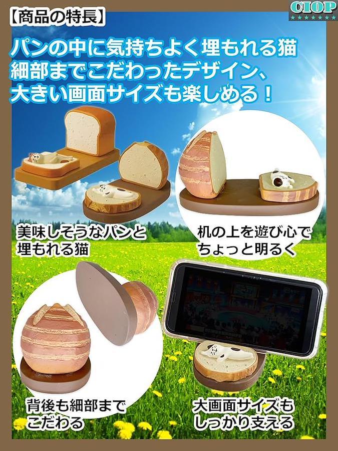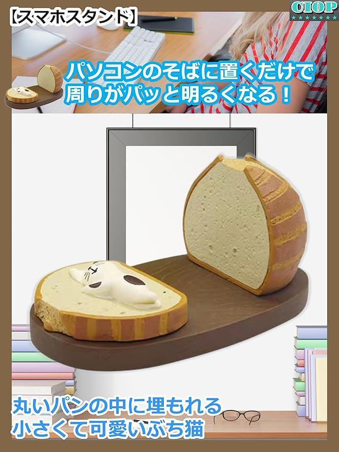 「ユニークなデザイン」:優しくコミカルで 丸いパン に埋もれる かわいい 白黒猫 があなたのスマホをやさしく支え見守ってくれます。