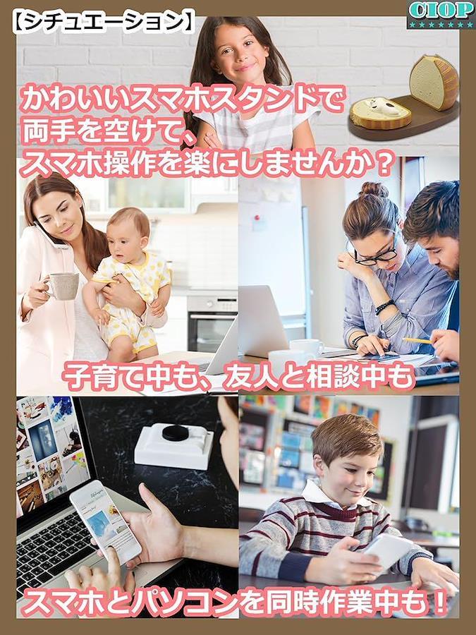 「 スペック」 サイズ:奥行き12cmx横6.5cmx高さ6.5cm / 重さ:約220g / カラー:ブラウン / 材質:合成樹脂 / 機能・用途:スマホスタンド、携帯スタンド、スマホ立て / 生産国:中国