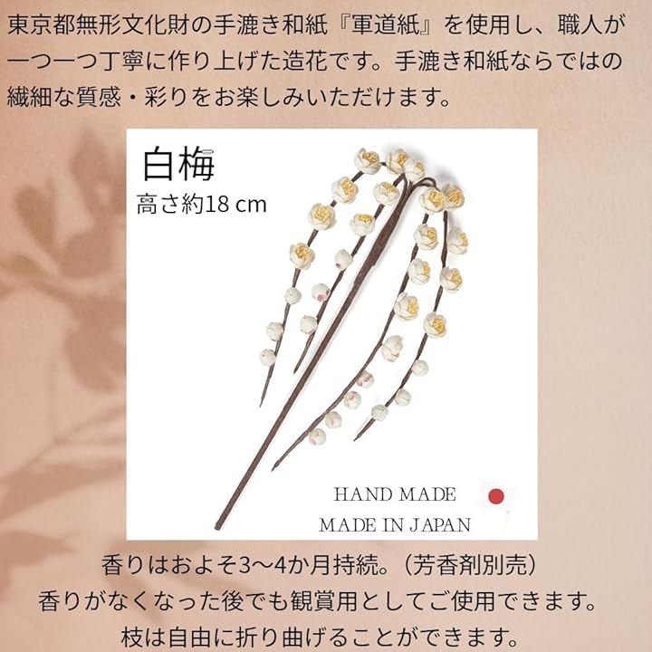 「手漉き和紙の美しさ」 東京都無形文化財の手漉き和紙「軍道紙」を使用し、職人が一つ一つ丁寧に作り上げた造花です。