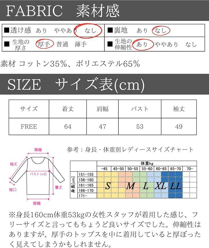 「素材」コットン35%、ポリエステル65% 「カラー」ベージュ、グレー、ブラック、グリーン「サイズ(cm)」free size 着丈64/肩幅47/バスト53/袖丈49