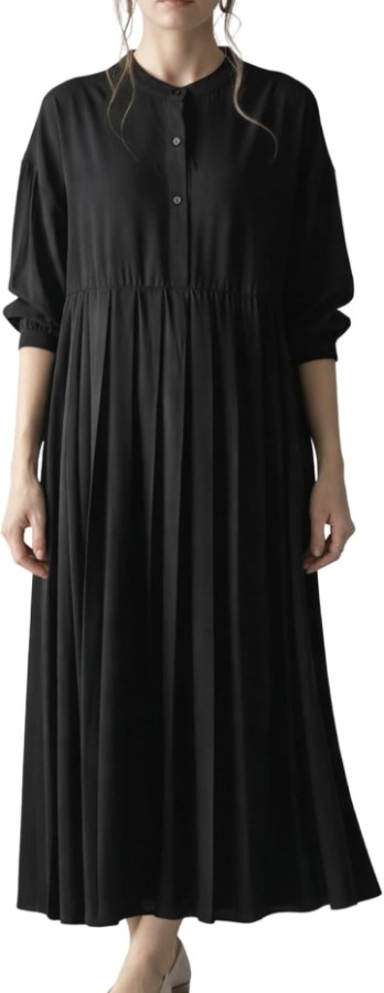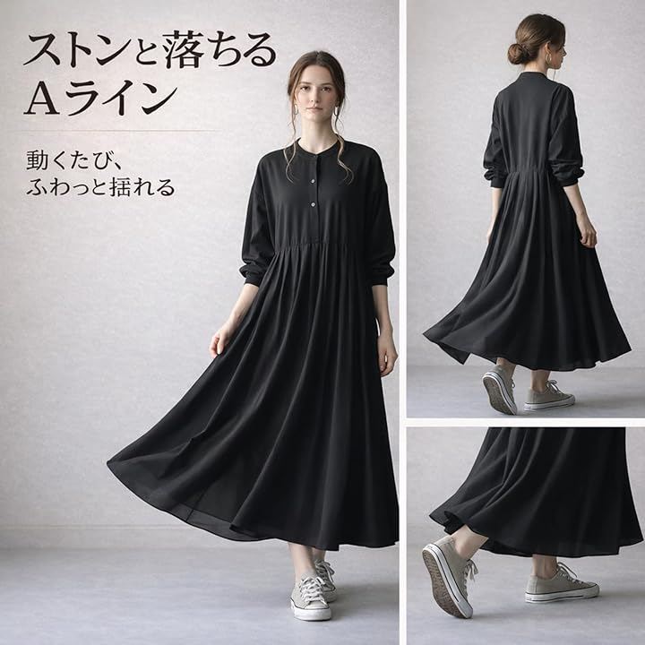体のラインを拾いにくく、リラックスして過ごせる一着で、日常使いにも取り入れやすい落ち着いた雰囲気に仕上がっています。