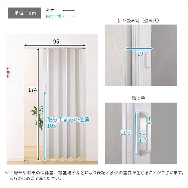 【素材】本体・レール:PVC取っ手:ABS樹脂ランナー:ポリアセタールマグネット受け:スチール【商品サイズ】W95×H174cm【商品重量】約4kg【梱包サイズ】W11×D8.5×H180cm【梱包重量】約5kg【生産国】中国【カラー】ライトブラウン、ダークブラウン、ホワイトオーク【その他】ドア幅は製品特性上、若干大きめに作られている為、締めた時にフラット(平らな状態)になりません。レールの幅を短くするには、ノコギリをご用意して頂く必要がございます。>>木目調パネルドア