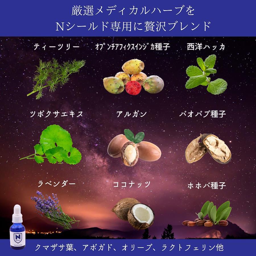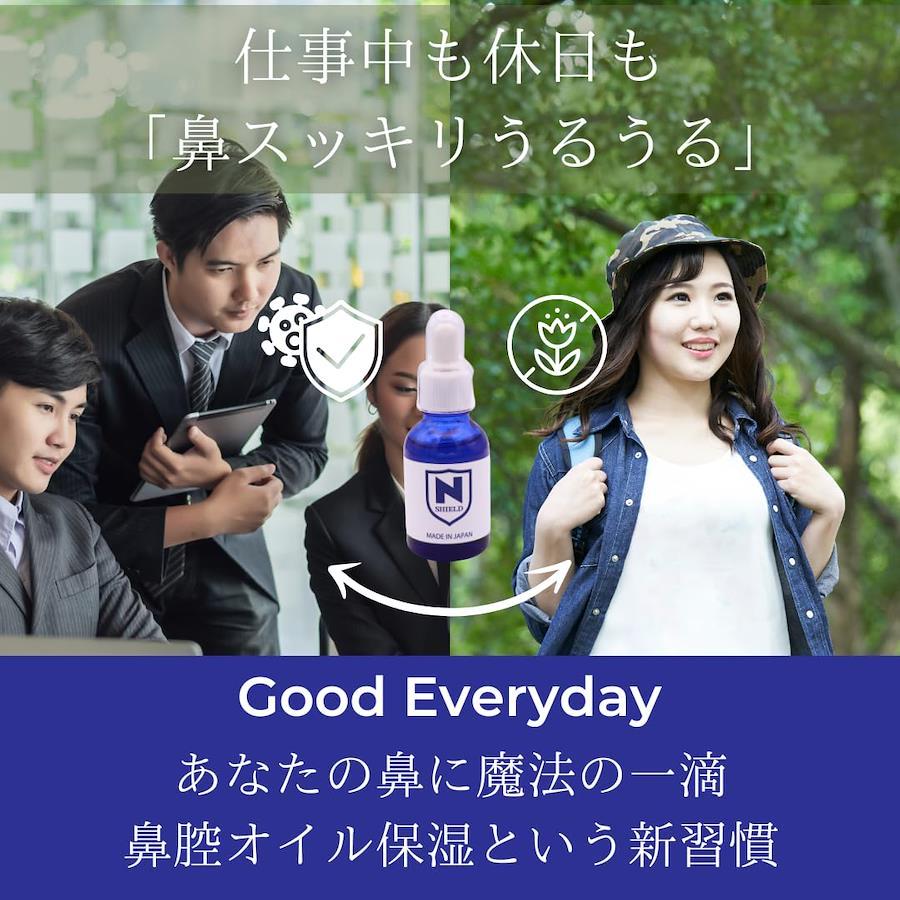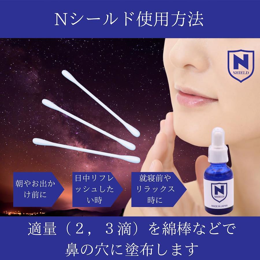 新習慣!鼻の中に塗るオイル 「Nシールド」はティーツリーオイル、クマザサエキス、西洋ハッカオイル等の厳選された精油を鼻腔内シールド保湿専用にブレンド! 数年にわたるブレンドテストから生まれた鼻腔環境最適化ブレンドオイル。Nシールドだけの専用ブレンドで鼻の内からうるおい&シールドコーティング。 現代人が低下しがちな鼻腔内のうるおい&保護機能を日々サポートしながら、ハーブの力でより清潔に自然な鼻呼吸を促します。お出かけ前やおやすみ前に、 スポーツやヨガの前に、さっとひと塗り新習慣! 【塗るマスク】自然ハーブの成分で鼻粘膜をうるうる保湿・清潔シールドコーティングする新発想オイル ティーツリー・クマザサ・西洋ハッカ等のシールド機能の高い天然ハーブオイルを鼻腔用に世界でNシールドだけの専用ブレンド お手軽なひと塗り習慣で気持ちのいい毎日を!ハーバルグリーンのほのかな香りでリフレッシュ&リラックス 【使用方法】綿棒等に適量をとり鼻の穴の内側に適量を塗布してご使用ください 一本(20ml)あたり、お出かけ前や就寝前など一日に1、2回のご利用で約一ヶ月から一ヶ月半分