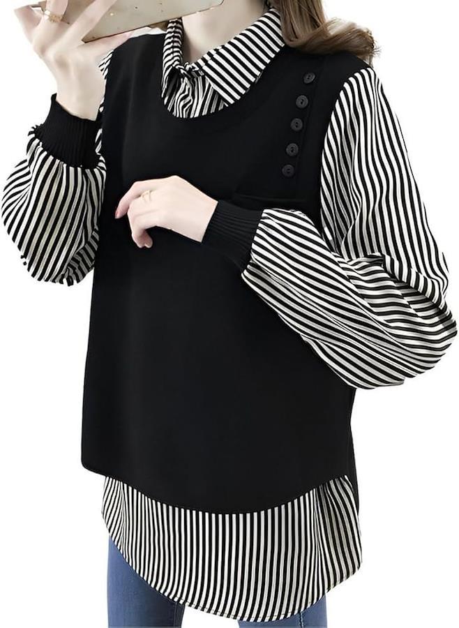 「1枚で主役級」重ね着風トップス レディース 長袖 春 秋 チュニック 異素材 ミックス レイヤード風 ニットベスト ストライプ ブラウス シャツは、オシャレとモダンを融合したデザインです。