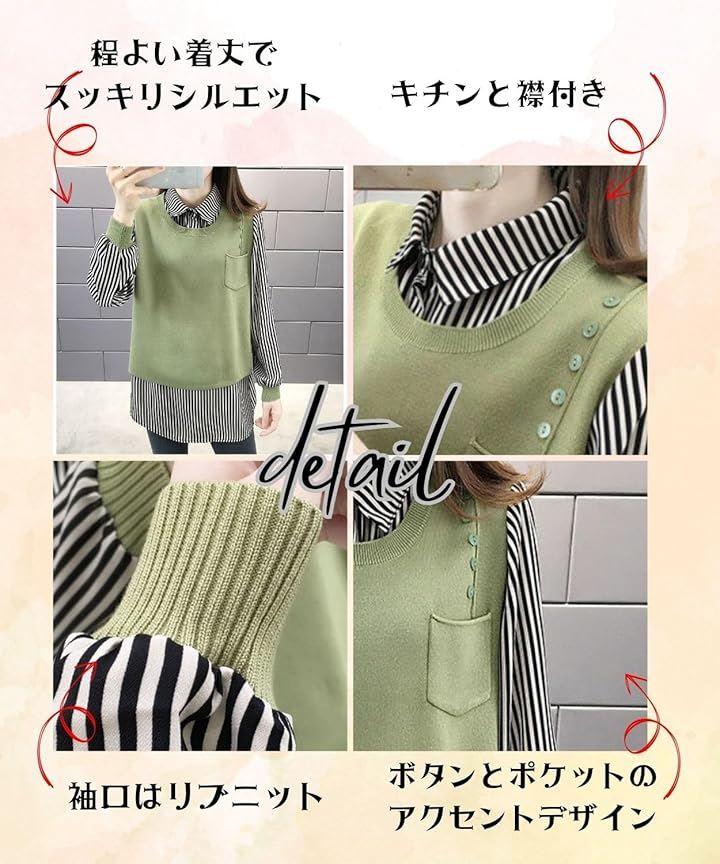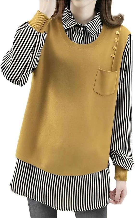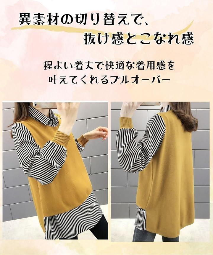 「1枚で主役級」重ね着風トップス レディース 長袖 春 秋 チュニック 異素材 ミックス レイヤード風 ニットベスト ストライプ ブラウス シャツは、オシャレとモダンを融合したデザインです。