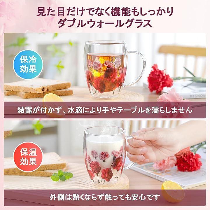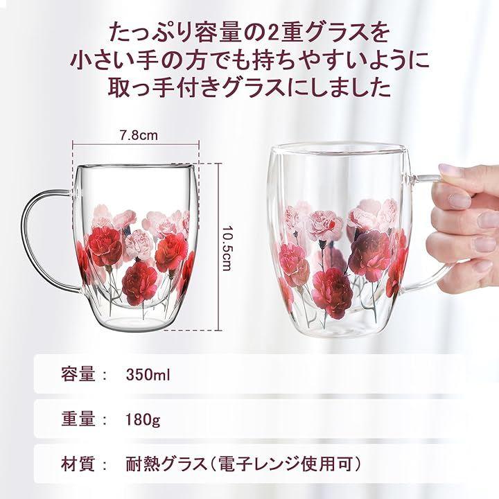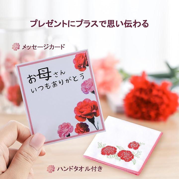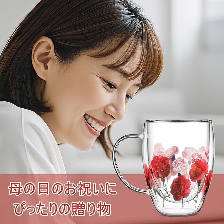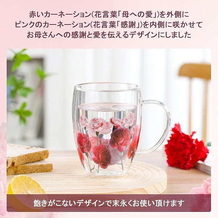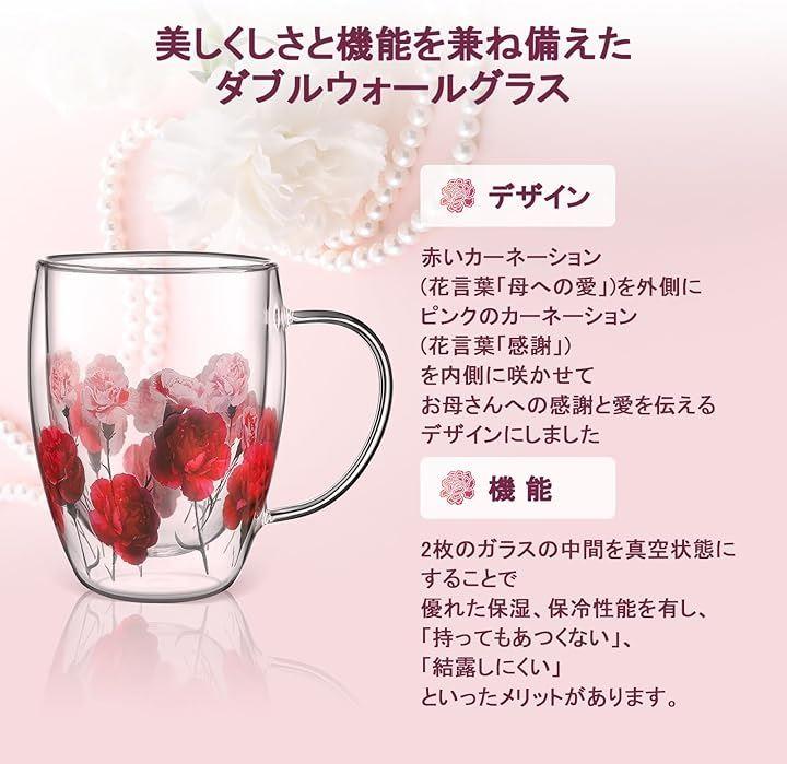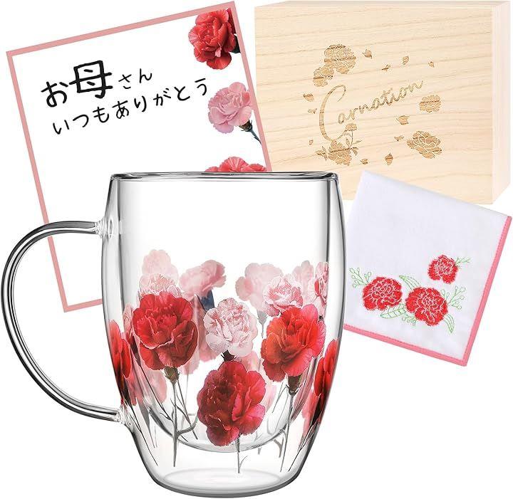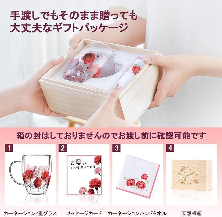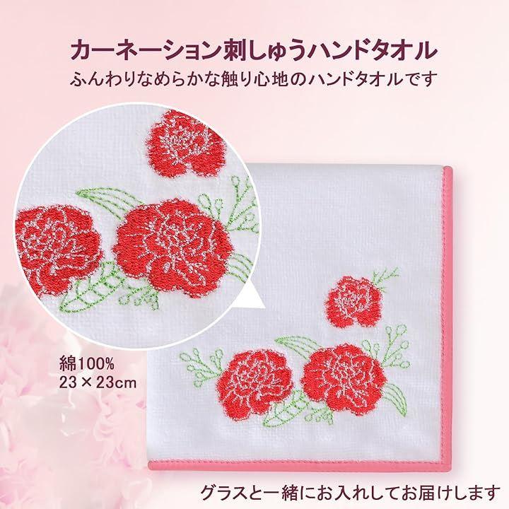 「母の日の贈り物に最適」 このカーネーションデザインのダブルウォールグラス、刺しゅう入りハンドタオル、そして心温まるメッセージカードがセットになったこの商品は、母の日やお誕生日にお母さんへ感謝を伝えるぴったりなギフトです。