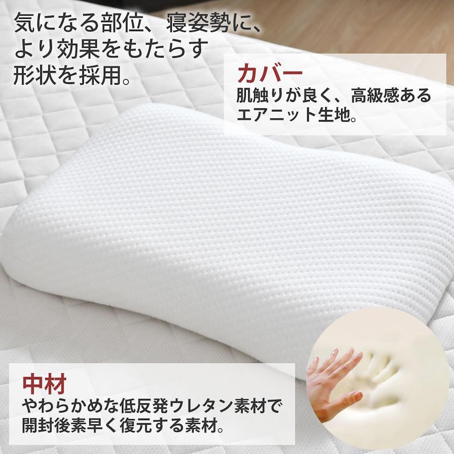 【商品情報】体圧分散効果高い低めの位置でキープ 質の良い眠りを実現頭が沈み込まずしっかり「じんわり」支えるので高さが低めでも気になりません。仰向け寝、横向き寝どちらでもしっかり首をサポートする様に、形や素材にもこだわりました。じんわりフィット!〇カバー:肌触りが良く、高級感あるエアニット生地。〇中材:やわらかめな低反発ウレタン素材で、開封後素早く復元する素材。〇形状:気になる部位、寝姿勢に、より効果をもたらす形状を採用しています。