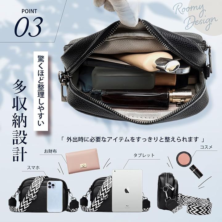 材質:頭層牛革 裏地:ポリエステル サイズ:21x15x8cm 重量:約0.31kg カラー:ブラック/ホワイト/ベージュ 内部:ファスナー暗袋・スマホポケット・証件袋 外部:背面ファスナーポケット ショルダーストラップ:調整可・取り外し可