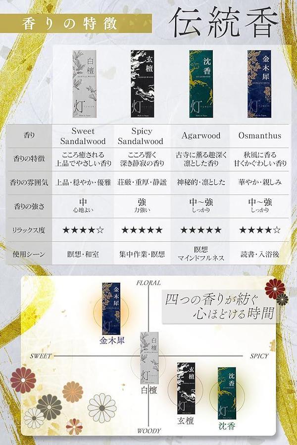 「4つの香りで心を整える」やさしく甘い「白檀」、華やかな「金木犀」、深く静かな「沈香」、そしてスパイシーな「玄檀」。