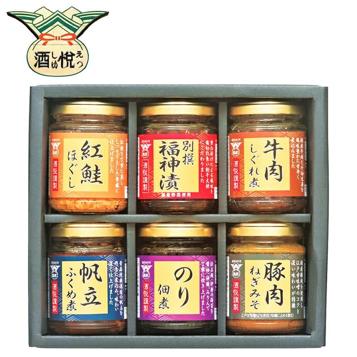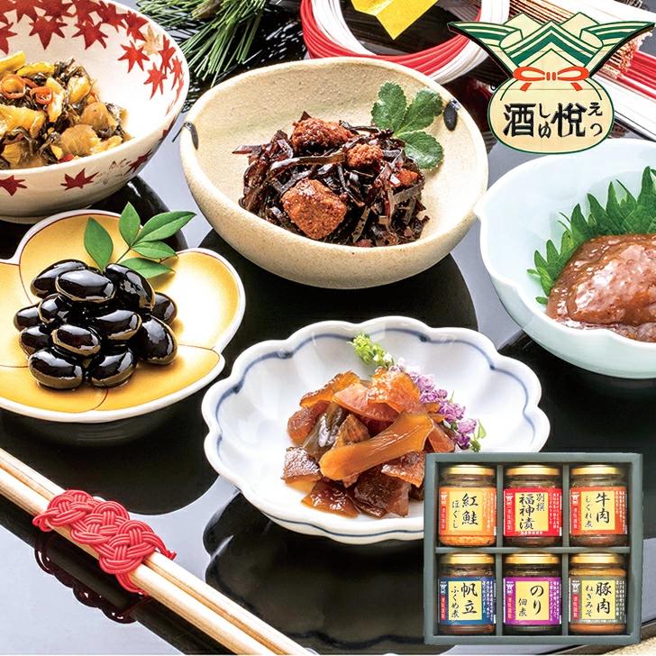 のり佃煮、豚肉ねぎみそ各125g、紅鮭ほぐし85g、牛肉しぐれ煮70g、別撰福神漬120g、帆立ふくめ煮120g(固形量55g)×各1【小麦】