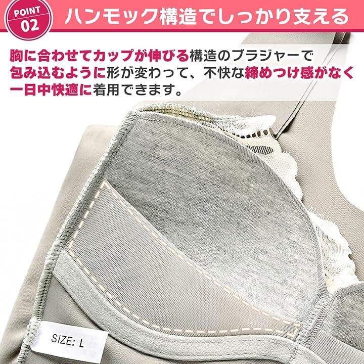 「柔らかい着心地」カップ内部から胸をしっかりと固定し、ズレにくく、安定感のある着け心地を提供します。