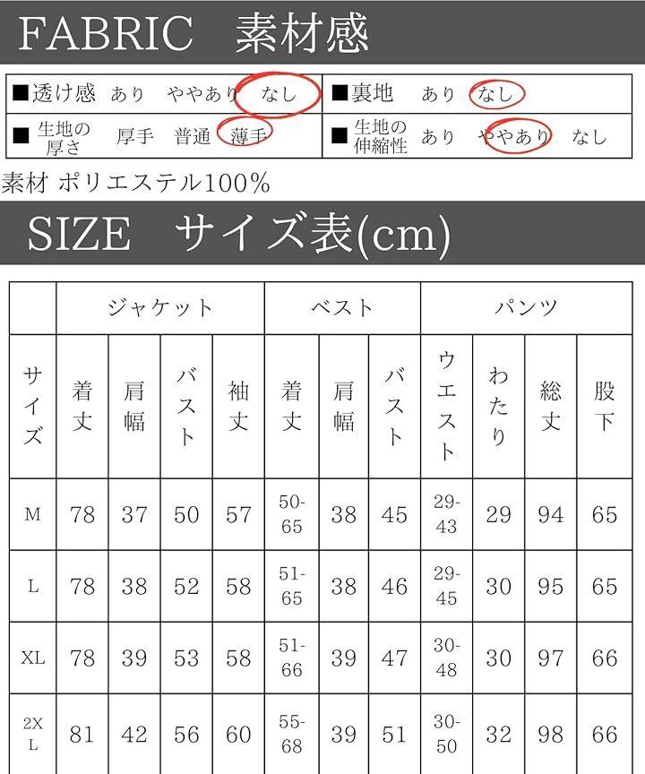 「素材」 ポリエステル 100% 「カラー」ブラック(黒)「サイズ(cm)」M ウエスト29-43/股上30/股下65/裾幅23/わたり29/総丈94 上1 肩幅38/身幅45/着丈50-65 上2 肩幅37/袖丈57/身幅50/総丈78 L ウエスト29.5-45/股上31/股下65/裾幅24/わたり30/総丈95 上1 肩幅38/身幅46/着丈51-65 上2 肩幅38/袖丈58/身幅52/総丈78 XL ウエスト30.5-48/股上31/股下66/裾幅24/わたり30/総丈97 上1 肩幅39/身幅47/着丈50-66 上2 肩幅39/袖丈58/身幅53/総丈78 2XL ウエスト30.5-50/股上32/股下66/裾幅25/わたり32/総丈98 上1 肩幅39/身幅51/着丈55-68 上2 肩幅42/袖丈60/身幅56/総丈81