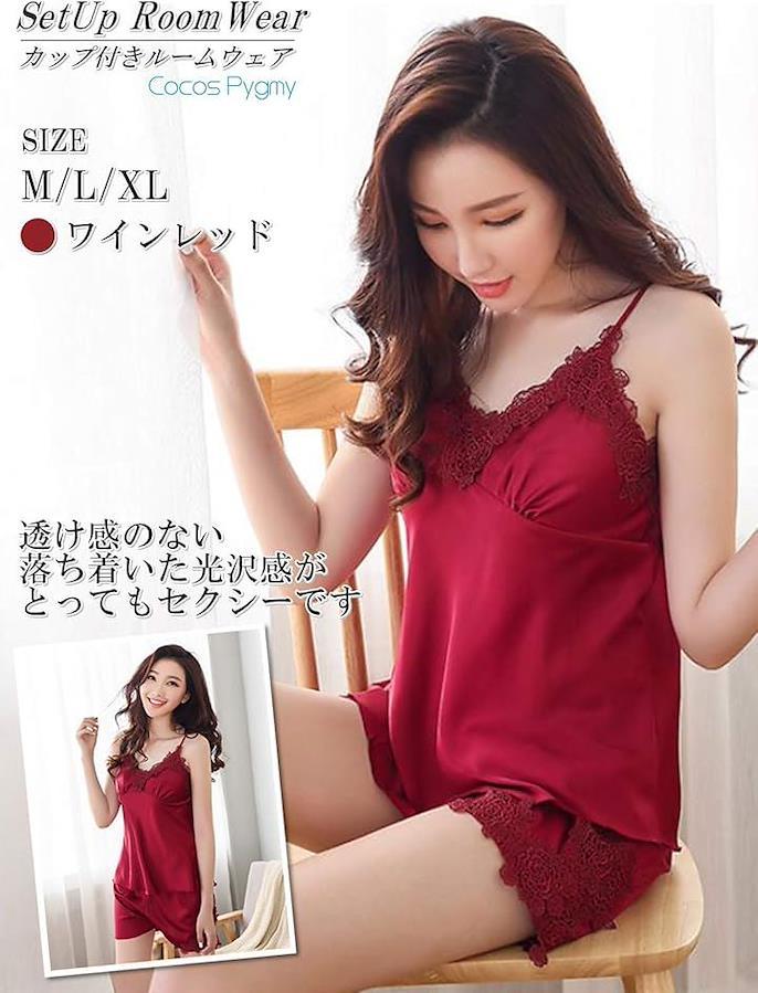 カップ付きのキャミソールとショートパンツの2点セットのリラックスレディースルームウェアです。