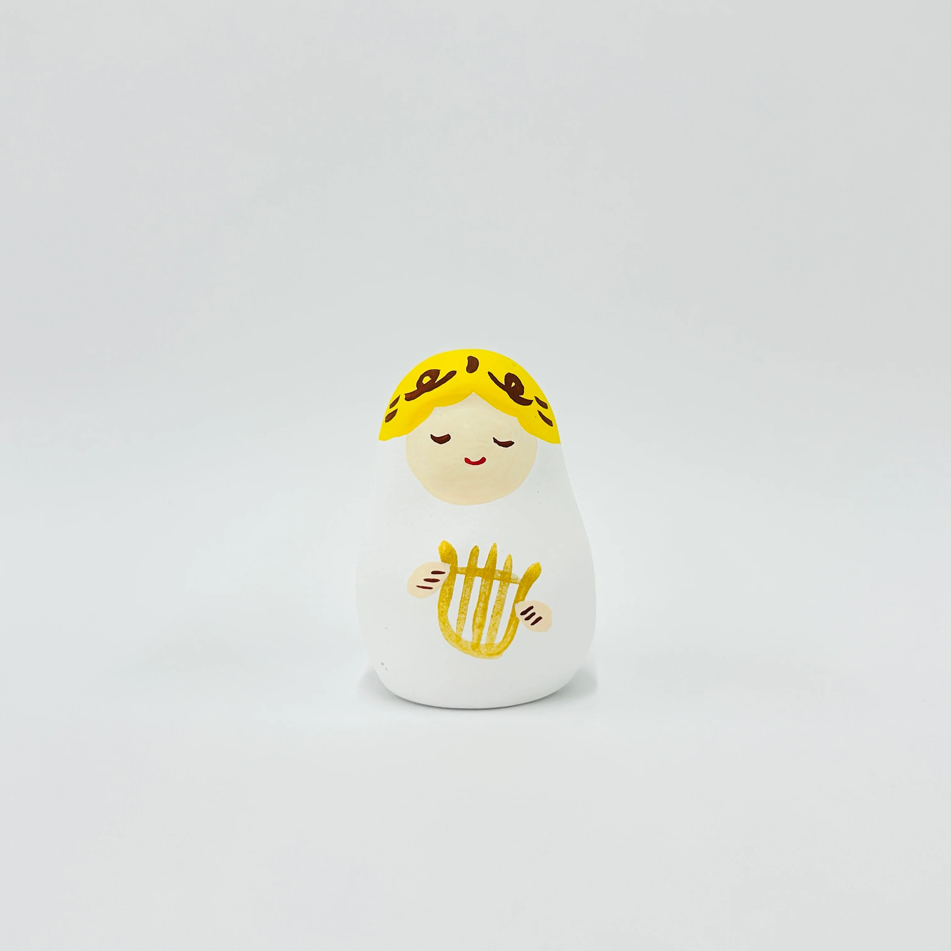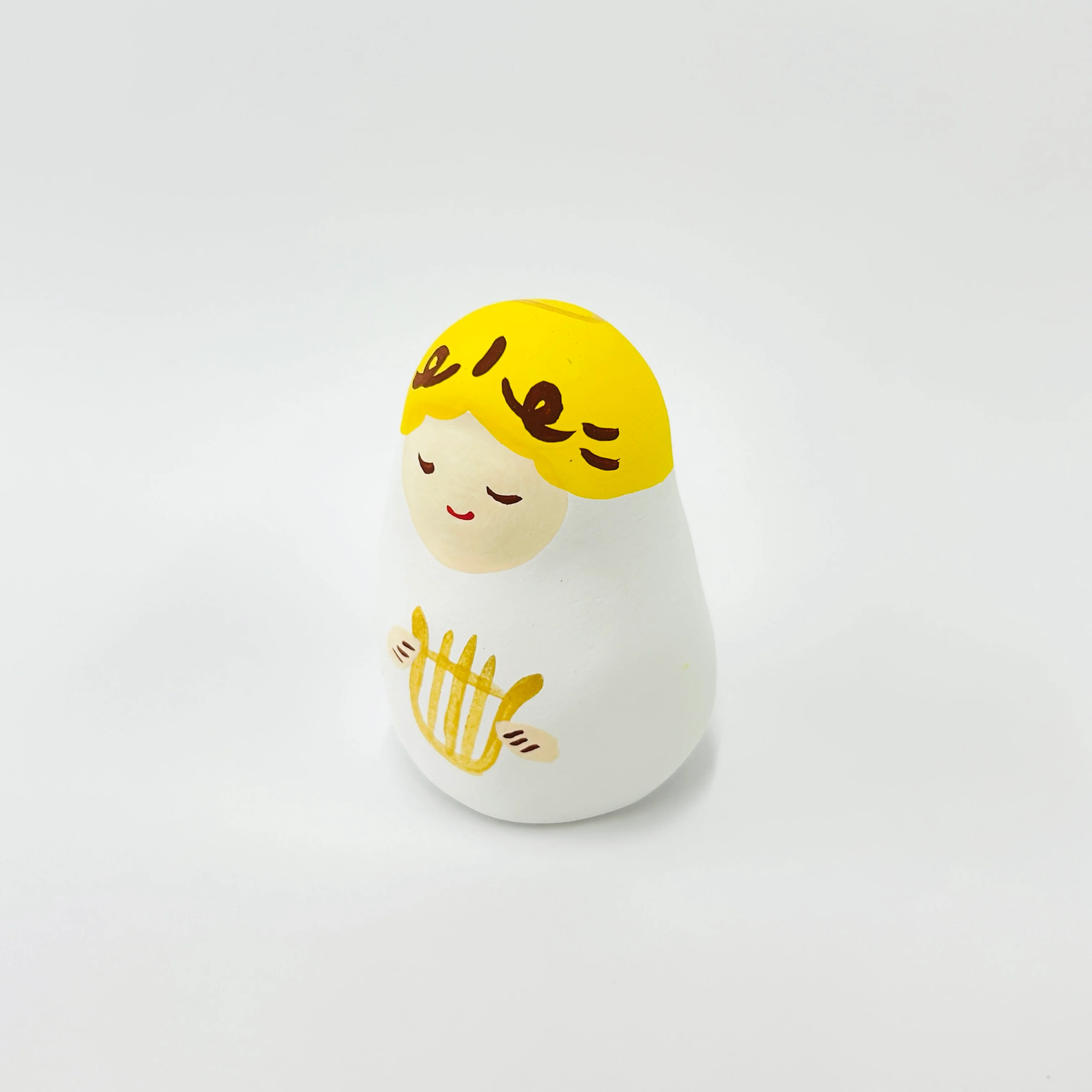 やわらかな黄色の髪と金の楽器が軽やかに輝き、インテリアにもよく馴染みます。