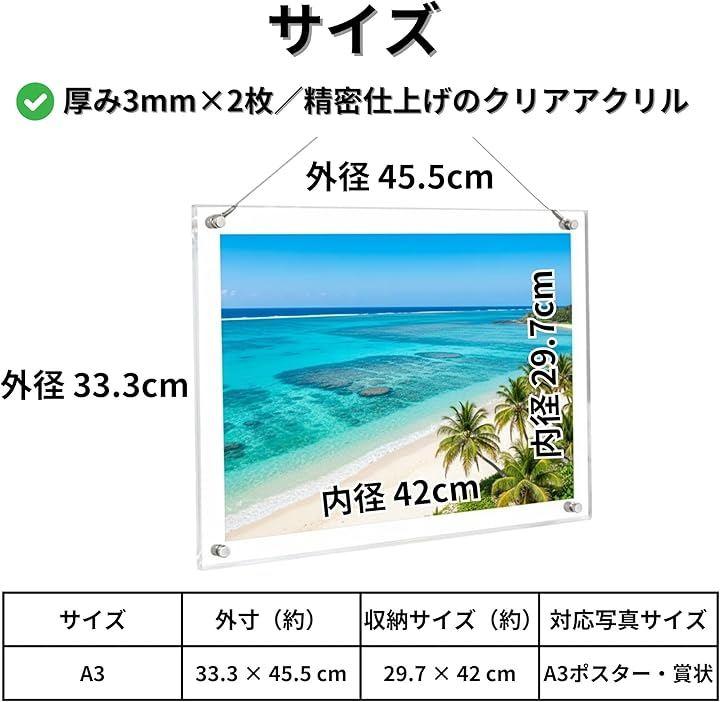 bath&bath アクリルフォトフレーム A3 透明 写真立て 壁掛け スタンド 両対応 ポスターフレーム 額縁 卓上A3判(297x420mm)に対応する外形333x455mmのフレームレス設計で写真や賞状・証書・ポスターなどをクリアに美しく飾れるアクリルフォトフレームです。