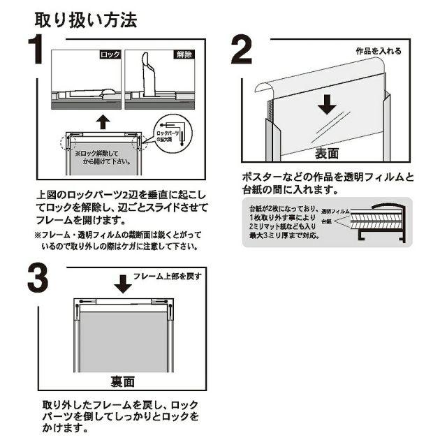 シンプルでシャープなスタイリング。軽くて丈夫なアルミフレームです。プラスチックのロックパーツで簡単に開閉可能。ポスター・写真・POPなど使用に合わせて幅広いサイズから選べます。中材が2枚になっており、1枚取り外す事により2mmマット紙も入り最大3mmまで対応。