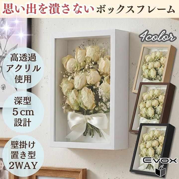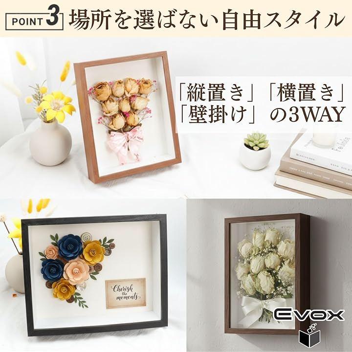 一般的な額縁とは異なり、中空構造になっているため、厚みのある小物やドライフラワー、思い出の品などを自由に配置できる立体フレームとして多用途に活躍します。