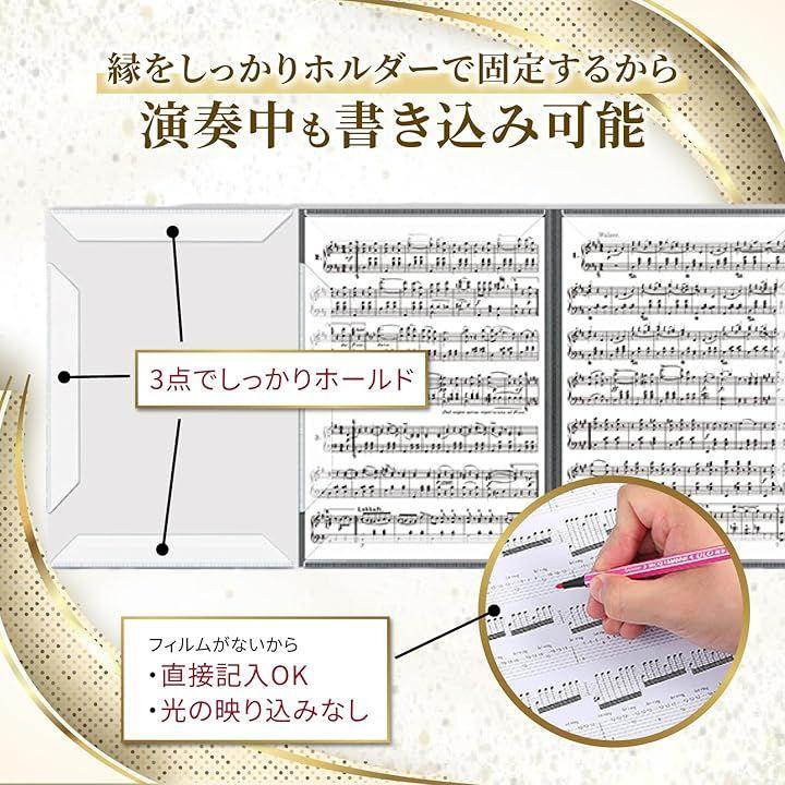 「差し込み簡単」3点ポケット式で、楽譜を差し込むだけ。