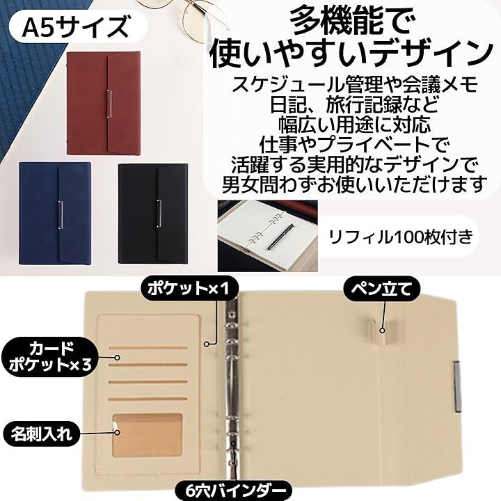 「多機能で使いやすいデザイン」 A5サイズのシステム手帳は、カードポケットやペンホルダー、ハガキも入る収納ポケットを備え、スケジュール管理や会議メモ、日記、旅行記録など幅広い用途に対応。