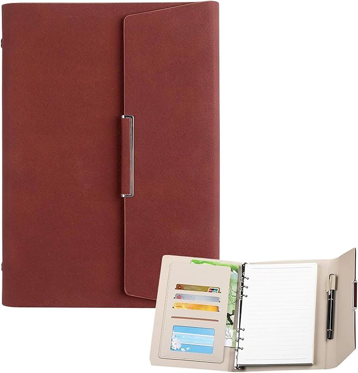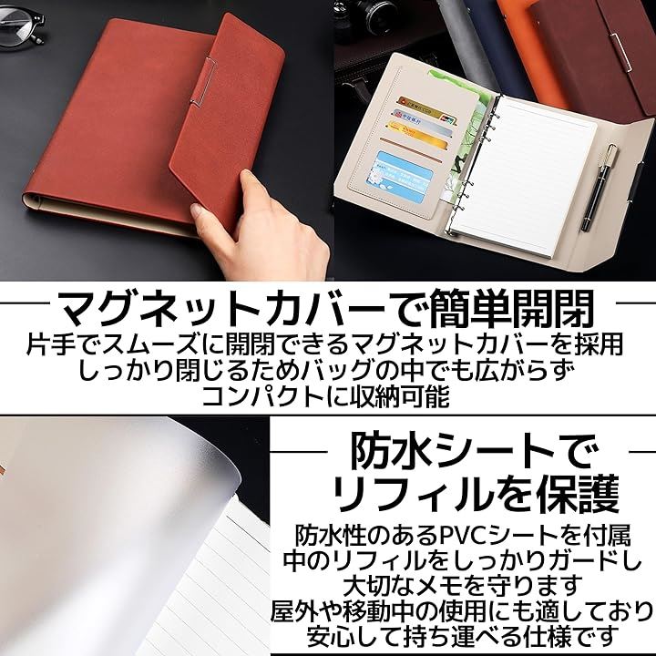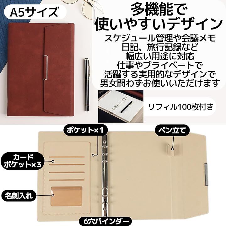 「多機能で使いやすいデザイン」 A5サイズのシステム手帳は、カードポケットやペンホルダー、ハガキも入る収納ポケットを備え、スケジュール管理や会議メモ、日記、旅行記録など幅広い用途に対応。