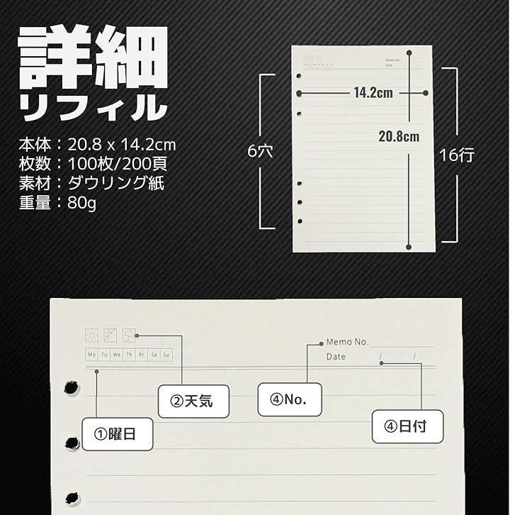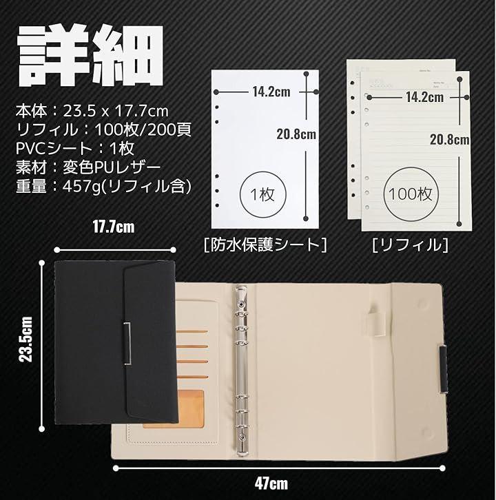 「詳細」本体:23.5 x 17.7cm リフィル:100枚/200頁 PVCシート:1枚 素材:変色PUレザー 重量:457g(リフィル含)