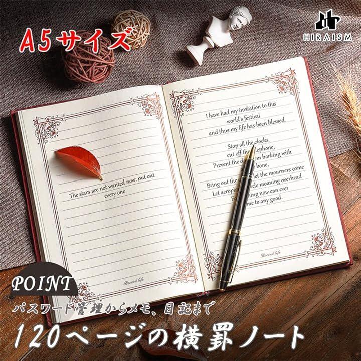パスワード管理からメモ、日記まで幅広く使える120ページの横罫ノートです。
