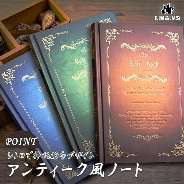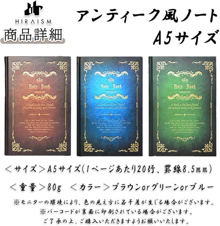 「商品内容」アンティーク風ノート <サイズ>A5サイズ(1ページあたり20行、罫線8.5mm) <重量>80g <カラー>ブラウンorグリーンorブルー *モニターの環境により、色の見え方に若干差が生じる場合がございます。