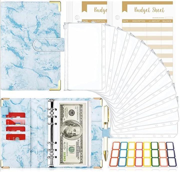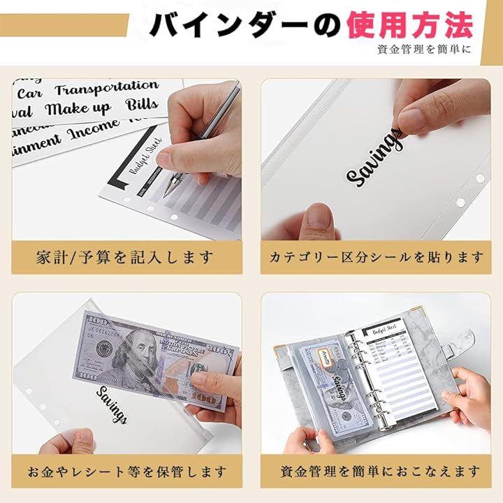 「商品内容」製品サイズ:19x13cm 適用:A6 仕様:ルーズリーフ ジッパー付きクリアケース:12枚 予算管理シート:12枚 英字ステッカー:2枚 カラーラベルシール:1枚 素材;PUレザー カラー:ブルー